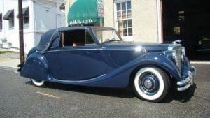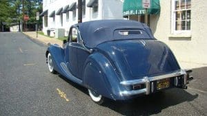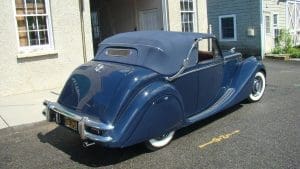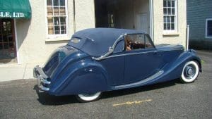 (Stock #3838.) (Chassis #G47142). (Engine #Z2088). Often mistaken for a pre-war design, the MK IV and MK V Jaguars have the amazingly elegant design of the 1930’s. Since production of the English cars ceased during the WW II years, that design was carried on for several years following the war as new, more rounded designs were developed. A total of just 972 MK V convertibles were built. They were offered with two engine choices—the 2.5 litre engine, popular in England and the more powerful 3.5 litre unit which Americans seemed to favor, and were offered in either right-hand or left-hand drive. This car, delivered new in the U.S. with left-hand steering, was fitted with the 3.5 litre unit so is a rare beast. With that engine and the 4-speed manual transmission, the car was well-suited to driving on American roads. This car is beautifully finished in midnight blue with cognac leather, fabulous burl walnut facia and interior trim and a dark blue convertible top with chrome landau irons. It came to us following its restoration in California and is absolutely gorgeous. It has a comprehensive tool kit fitted to its boot lid and is accompanied by an original owner’s manual. SOLD!