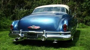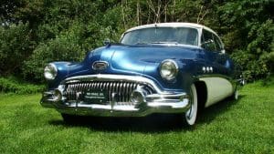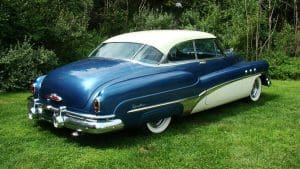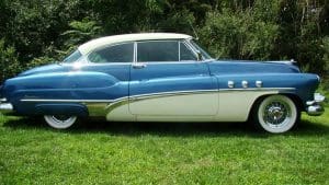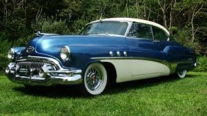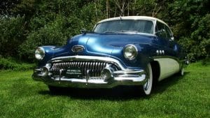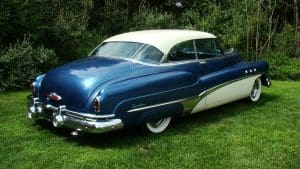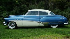1951 BUICK SUPER RIVIERA HARDTOP COUPE #46264179. (Stock #4121.) Buick always had a loyal customer base who appreciated the quality and design of the cars. Following World War II, America was feeling good about itself and wanted cars of a sporting nature. In 1950, Buick built a very sporty 2-door luxury hardtop coupe, he Riviera to fill this niche. Our car is gorgeous in radiant blue with white top with matching white lower side body panels, an immaculate blue and white interior and sparkling Buick Skylark chrome wire wheels. It is fitted with the famous Buick “Fireball 8” engine, the Dynaflow automatic transmission, power steering and dual exhaust system. The car looks fabulous and its driving characteristics match. A very knowledgeable long-time Stable customer attended a Concours event in Florida while spending the winter at his home there, spotted this car and called a close friend, a Buick collector. The friend purchased the car on the spot and enjoyed it until his passing earlier this year. We are now proud to be selling the car for his estate. SOLD