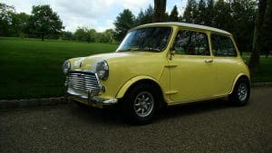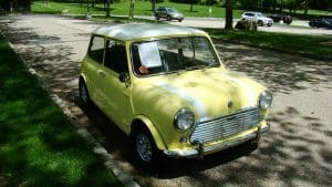 The concept of the Mini came to life as a response to the Suez Oil Crisis in 1956. As prices of petrol skyrocketed, the need for a small, fuel-efficient vehicle with room for four adults became obvious. Alex Issigonis and his team of 8 designers, draughtsmen and engineers introduced the Mini in 1957 and production started in 1958. The cars were an immediate success and have remained extremely popular through the years. The Mark II was introduced in 1967 featuring many design enhancements and the engine size was increased from 850cc to a whopping 998cc. Some were built in other countries, but our car was built at the Longbridge factory in Birmingham, England on April 17, 1968. Its’ design was advanced in many ways and the car featured a dual-line braking system, a transverse-mounted 4-cylinder engine and a fully synchronized 4-speed manual transmission although the car still featured sliding side curtains in the doors. Although the car rides on 10” wheels, is just 10 feet in length, 55.5 inches wide and 53 inches tall, it does accommodate 4 adults in relative comfort. Finished in a very attractive soft yellow with a white top and stripes with a black interior, the body is virtually unmarked, the interior shows very little wear and the car drives beautifully. 48,098 miles
