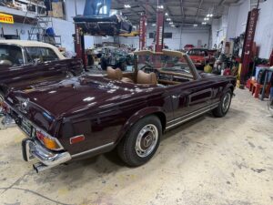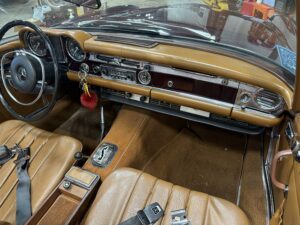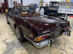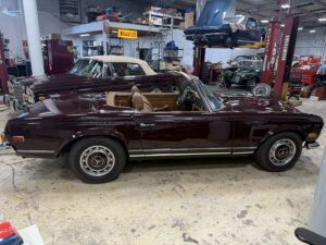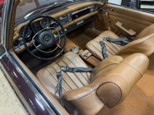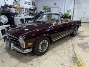 1971 MERCEDES-BENZ 280SL COUPE ROADSTER #113.044-12-022279. (Stock # 4445) The 280SL was the last of the highly desirable and increasingly collectible “Pagoda” SL Series which was introduced by Mercedes-Benz in 1964 with the 230SL and ended in 1971 with the 280SL. Our car is a “Holy Grail” -type example of the series. We purchased the car 23 years ago, then with 37,015 miles, from its original local owner. Another local (Princeton) man had been looking for as nice, correct, original and low mileage an example as could be found–as a birthday gift for his wife. This was the car! It has since been cherished by the recipient of the gift ever since. It has been kept covered in their heated garage and driven for special occasions. nice weather outings and occasional shows, being driven just 4.421 miles in the 23 years it has been with its second owners. Finished in near-flawless garnet (body and hard top) with beautiful and completely original cognac interior and just as nice convertible top. It was ordered with a 4-speed automatic transmission, air conditioning, Blaupunkt AM-FM stereo, power steering, power disc brakes, chrome bumper overriders, etc. and is accompanied by its original owners manuals, complete tool kit service records and full provenance since the car was delivered new. 41,436 miles. $165,000.