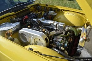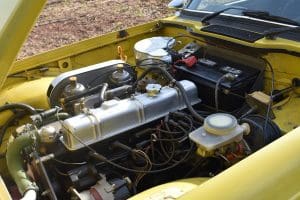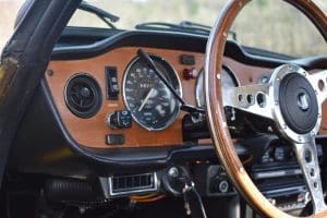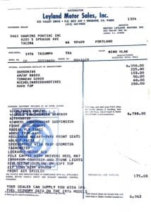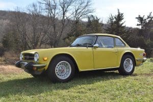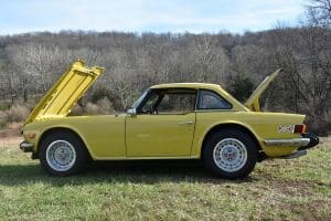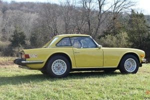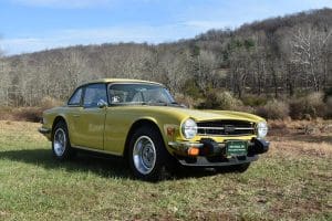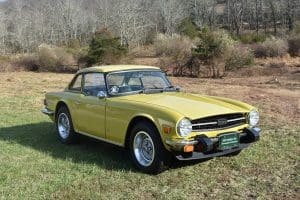 The Triumph Company was formed in England in 1885 and sold bicycles. It evolved over the years until, in the 1950's, very successful sports cars were being produced. The TR-2, 1953-1955, was an adorable 2-seater, 4-cylinder car which captured the heart of people around the world, but primarily in America. TR-3's and 4's followed, still very pretty 2-seater, 4 cylinder sports cars. In 1966, a very similar-looking car was introduced, but this time with a new 2.5 litre, twin carburetor, 6 cylinder engine, a 4-speed synchromesh transmission and new front disc brakes-the Triumph TR-6 roadster. A very successful car, TR-6 production continued on until the final car rolled off the assembly line in 1976. Our car is one of those very late cars delivered new to the West Coast and is as nice an example as any which we have seen in decades. It comes to us from a local British car collector from whom many other fine British treasures have come. He has retired and and sold his house, therein losing his 6-car garage. We have sold his Bentley GT and his Rolls-Royce Corniche among others and this one is a real find. Fitted with air conditioning, the car also has both its detachable hard top its stow-away convertible top and is fitted with a factory overdrive on its 4-speed transmission. It, as with his other car, has been kept in top mechanical condition and has recently had a full engine rebuild. Finished in beautiful original Mimosa Yellow with black interior (also original), top and top boot, the car is in gorgeous condition throughout and drives exactly as it should with textbook manners. Original window sticker and Bill of Sale! 82,096 miles. SOLD!