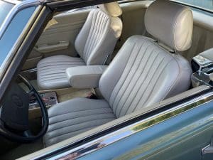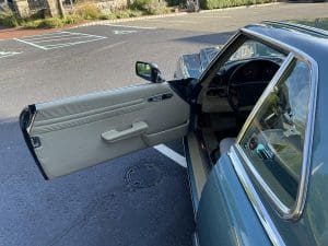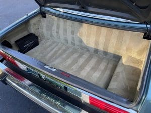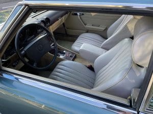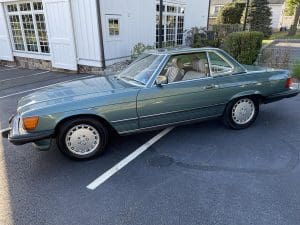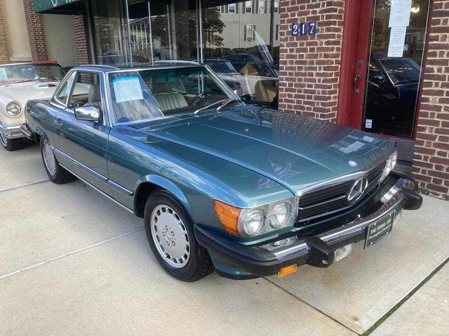 1987 MERCEDES-BENZ 560SL COUPE/ROADSTER #WDBBA48D5HA066889. (Stock #4181). The fabulous “107” body style  was introduced in 1971 and underwent many iterations during its 19 year run., ending with the 560SL, built from 1986 through 1989. The final form—the 560SL—was powered by the incredibly strong, twin timing chain, 5.6 litre, fuel-injected “V-8” engine which lent very impressive performance to the car.  With both convertible and detachable hard tops, the car was also equipped with climate control, cruise control, electric windows, locks and antenna, twin outside rear-view mirrors, leather seats, 15”factory alloy wheels, driver air bag, fog lamps and an AM-FM stereo system (our car has had a more modern Alpine MP# AM-FM/CD player installed). Finished in beautiful and rare M.B. Blue-Green  (body and hard top) with sumptuous original  Cream-Beige leather and black convertible top. Our car is one of those very rare finds which arises every once-in-a-while  in our area—an extremely low mileage  one owner car in 100%  original and pristine condition  throughout. It is complete with original manuals, tools and factory first aid kit, has never had any paintwork or damage and has been carefully kept by its only owner—a Mendham resident who purchased the car new from Powers Motor Company (now Morristown Mercedes-Benz) 34 years ago. 32,138 miles.