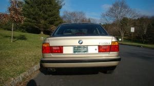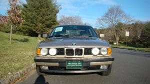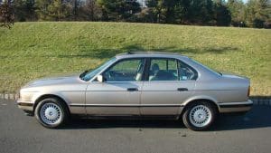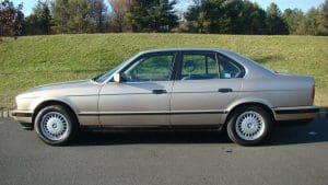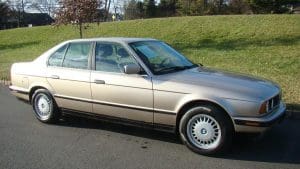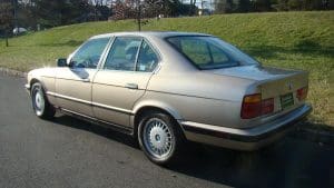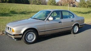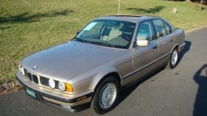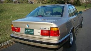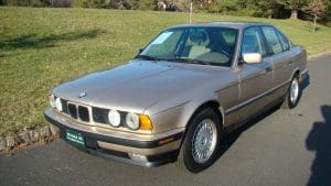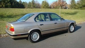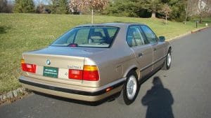 1994 BMW 525i SEDAN #WBAHD6321RBJ96164. (Stock #4143.) The BMW 5-Series has maintained a reputation of amazing durability and longevity. 1994 was the first year of the 3rd generation 5-Series and is acknowledged to be a very handsome car with excellent handling, comfort and safety. The 2.5 litre, fuel-injected, 24 valve, 6-cylinder engine and 5-speed automatic transmission deliver a top speed of 143 miles per hour, fuel economy of @30 miles per gallon on highway cruising and, with a 21+ gallon fuel tank, can travel more than 600 highway miles between fill-ups. Stopping power is excellent with 4-wheel , ABS power disc brakes, ventilated to the front, and the McPherson strut front suspension helps to provide excellent handling. The car features a very ergonomically logical interior with leather which wears as well as the mechanical components of the car. These are acknowledged to be cars which will deliver more than 300,000 miles in style, safety and comfort. Our car was delivered new to a Summit man who, following 9 years and fewer than 60,000 miles of driving, gave the car to his father who has carefully kept the car for 18 years until now stopping driving and selling the car to us. The pampered car has never seen any damage or paintwork and is in amazing good condition cosmetically and mechanically. The body is all original in Cashmere, and the original tan leather. is excellent. Original manuals, tools and both factory keys accompany the car. 142,845 miles.