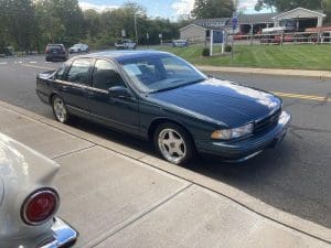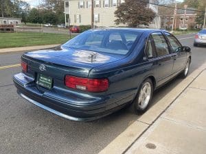 1996 CHEVROLET IMPALA “SS” SEDAN #1G1BL52P2TR127090. (Stock #4184.) To compensate for some unremarkable performance evident in their 1970’s, 1980’s and early 1990’s cars, General Motors built some interesting , and very quick, variations of their 4-door sedans. With Buick,GM built the “Grand National” and with Chevrolet, they built the “Impala SS.” Introduced in 1994, the Impala “SS” was based upon the Police Package Caprice sedan. Which included advanced design elements such as stronger ABS braking with 4-wheel power discs, a better cooling system, sport suspension, enhanced precise steering, dual exhaust, limited slip differential, etc. . This Police platform was a natural base for the high performance “SS.” Using the Corvette “LT-1” engine, the “SS” had many performance touches built-in as well as some luxury touches seen only on that car. The very comfortable front sport bucket seats are surrounded by a soft leather interior with “SS” embossed on each headrest. Front cornering lamps are built in to the headlights, a subtle rear spoiler is present on the rear deck lid, front and rear reading lamps are present,as is a tilt steering wheel, twin electric fold-away outside rear view mirrors, special 17``alloy wheels (our car is still wearing its original BF Goodrich “COMP ZR” speed-rated blackwall tires) which were designed specifically for the “SS,” stainless steel dual exhaust system, climate control, cruise control, power seat, locks, windows antenna and mirrors and even cup holders. A floor-shift automatic transmission was installed on the last year of production models, replacing the column shift on the 1994 and 1995 models and digital gauges from the first two years of production were replaced by analog gauges—including a tachometer—on the 1996 cars. The car is noted for its quick and precise steering which, along with the sport suspension and the 4-wheel power disc brakes with a Bosch ABS system, account for a most entertaining driving experience. Our car was purchased new from Connor Chevrolet in March, 1996 by a local (Watchung) woman who meticulously cared for the car, saved the original window sticker and manuals and never unwrapped the optional stereo earphones and remote. She only infrequently removed the car from its heated garage, driving the car just 15,151 miles in her 25 years of ownership. She ordered the car in beautiful grey-green with light grey leather—another item available only on the 1996 models. The earlier “SS” cars were originally available only in black while dark red and this beautiful green were offered on 1996’s. There has never been any damage or paintwork to the car and it is very close to original showroom condition inside, outside, underneath and mechanically. Just serviced by us. 15,131 miles. SOLD!