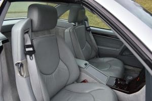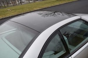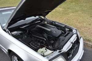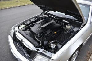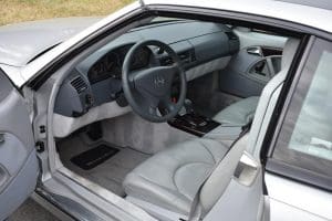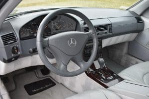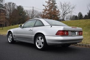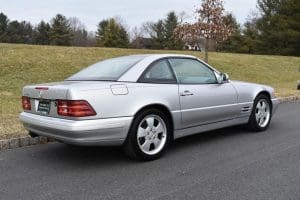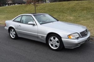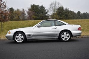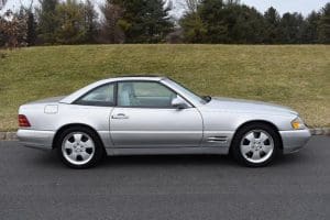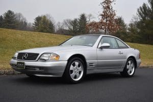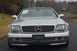 1999 MERCEDES-BENZ “PANORAMA” SL-500 COUPE/ROADSTER #WDBFA68FXFFX174604. (Stock #4147.) In 1999, a Greenwich, Ct. man was presented with this beautiful car as a Christmas gift by his wife. The car led a very pampered life until that owner's passing in 2015. At that time, we were able to purchase the car from his estate, , then with 21,195 miles. We then sold the car to a long-time local (Far Hills) customer who has continued exceptional care of the car, being serviced by us by the book” since selling the car to him and has been driven fewer than 5,000 miles per year by that second owner. Finished in Brilliant Silver with Ash Nappa leather , body-matching detachable hard top—with the rare and great-looking "Panorama” option, black convertible top and lovely dark polished mahogany console and cabin trim. The car is accompanied by its original window sticker, service records from new, original took kit, first aid kit and manuals. Safety features ion the car include: twin airbags, ABS anti-lock brakes, automatic pop-up roll bar in case of an impending incident, headlight washers and wipers, etc. Luxury features, other than the Panorama roof, include optional 17" factory alloy wheels, factory AM-FM stereo system , cruise and climate controls, electric windows and seats (with both driver and passenger memories), full Nappa leather interior, hard-top storage stand and cover, etc. Pristine original condition throughout. 48,475 miles. SOLD!
