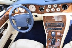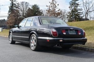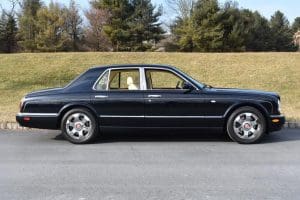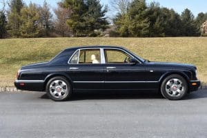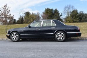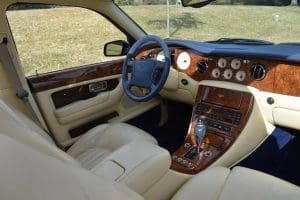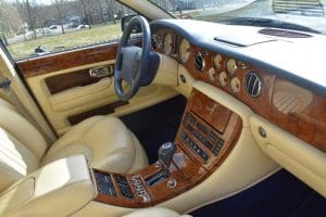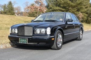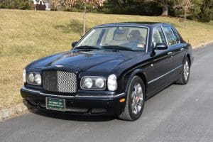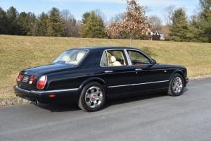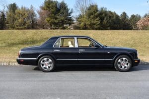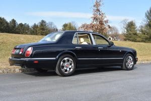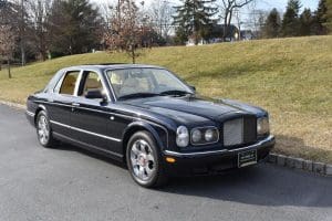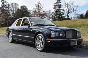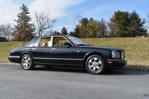 2000 BENTLEYARNAGE RED LABEL SALOON #SCBLC31E7YCX05195. (Stock #4106.) Powered by a Garrett-turbocharged, 6.75 litre, 400 horsepower, V-8 engine, the Arnage is a 5,560 pound absolute luxury car with acceleration of 0-60 mph in 5.,9 seconds and a top-speed limited to 155 mph—an amazing combination of luxury, safety and performance—something might be expected in a car which listed new at more than $200,000. Our car, gorgeous in deep Sapphire Blue with lovely Cotswold Beige Connolly hide interior and fabulous polished walnut facia, interior trim and optional full door panels was delivered new in Rancho Mirage, California, on September 25.2000, and remained with that family until July of 2007. At that time, the car found a new home in Alpine, New Jersey and then, in 2009 with 26,875 miles, we sold the car to a local (Gladstone) equestrian who sent the car to his home in Delray Beach, Florida. The car has been carefully maintained and has been a fixture at equestrian events both locally and in Florida. It now has a mileage of just 32,031 and we are selling the car for the estate of that local owner. SOLD!